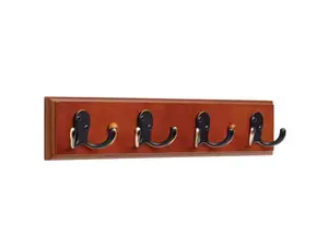 Add a touch of sophistication to your home with the Elegant Dark Caramel & Bronze Double Prong Hook Rail. This stylish hook rail features a rich medium brown wood rail adorned with four double-pronged bronze hooks, elegantly highlighted with copper accents.