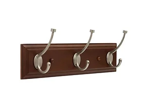 Enhance your home decor with the Elegant Cocoa & Satin Nickel Wall Rail. This stylish piece features a rich cocoa wood finish complemented by three satin nickel hooks, making it perfect for organizing various items such as coats, hats, and bags.