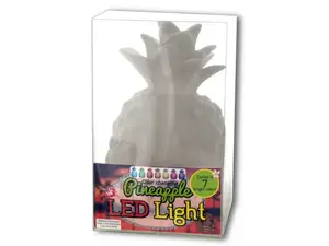 Add a unique, tropical touch to your space with this Color Changing Pineapple LED Light featuring a white plastic pineapple-shaped lamp that cycles through 7 colors for a soothing, magical display. Realistic design provides a welcoming island vibe all-year round. Great for indoor and outdoor use. Measures approximately 9" tall x 5" in diameter. Requires 3 'AA' batteries (not included). Comes packaged in an individual box. Box measures approximately 5.5" x 5.5" x 9".