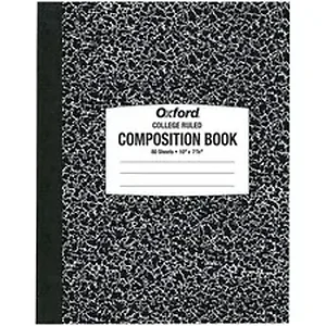 Composition notebook contains 80 sheets of center-stitched white paper in a marble black board cover. Sheets are college-ruled with margins. Durable rip-proof binding secures pages.