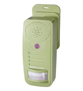 - Bird Chaser- Repels crows, pigeons, blackbirds, & sparrows- Uses two deterrant methods: recording of predatory birds and an ultrasonic sound- Built-in motion sensor- Adjustable volume- Easy to install and adjust settings depending on your preference- Ideal for farms, yards, orchards, gardens and public buildings where birds tend to flock- Powered by 3 D batteries- Detection Distance: 8 yards- Detection Angle: 110 degree