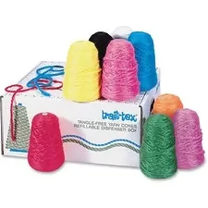 Sturdy yarn dispenser box provides an easy tangle-free solution for multiple crafters to work at one time. Jumbo acrylic school-roving yarn comes in nine bright colors. Each three-ply, 8 oz. cone includes approximately 150 yards. Colors include white, yellow, red, hot pink, lavender, black, light green, orange and light blue.