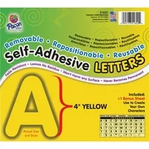 Self-adhesive letters are removable, repositionable and reusable. Letters are easy to use and require no punching out of letters, no staples, no pins and no tape. Simply peel and place. Self-adhesive letters adhere to any clean, dry surface that is smooth or slightly textured (even wood and a painted brick wall). They are fade-resistant and acid-free. Unique adhesive leaves no residue and never become permanent. Set of 78 characters includes 4" uppercase letters along with numbers and punctuation marks. Ideal for bulletin boards, signs, posters, presentation boards and much more.