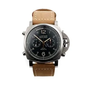 Panerai PAM00652 Luminor 1950 Automatic Black Dial Men's Watch Brushed titanium case with a brown (calfskin) leather strap. Fixed titanium bezel. Black dial with luminous silver-tone hands and Arabic numeral hour markers. Minute markers around the outer rim. Tachymeter scale in knots (nautical miles). Dial Type: Analog. Luminescent hands and markers. Chronograph - two sub-dials displaying: 60 second and 12 hours. Panerai calibre P.9100/R automatic movement with a 3-day power reserve. Scratch resistant sapphire crystal. Screw down crown. Solid case back. Cushion case shape. Case size: 47 mm. Band width: 22 mm. Tang clasp. Water resistant at 100 meters / 330 feet. Functions: chronograph flyback, hour, minute, second, regatta countdown, seconds reset. Luxury watch style. Watch label: Swiss Made. Panerai Luminor 1950 Automatic Black Dial Men's Watch PAM00652. Features: Brand: Panerai Series: Luminor 1950 Watch Label: Swiss Made Movement: Automatic Case Size: 47 mm Case Material: Brushed Titanium Case Shape: Cushion Band Material: Calfskin Leather Band Type: Strap Band Color: Brown Dial Color: Black Type: Analog Crystal: Scratch Resistant Sapphire Hands: Luminous Silver-tone Dial Markers: Arabic Numeral Water Resistance: 100 meters / 330 feet