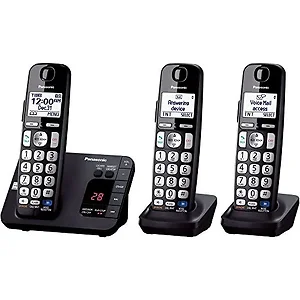 - Expandable Cordless Answering System with Large Keypad, 3 Handsets in Black- Dial easily with large buttons - Listen clearly in noisy spaces with amplified handset volume - Smart Function Key - Intelligent Eco Mode - Frequency: 1.9GHz - Corded or Cordless: Cordless - Speakerphone with 7-step volume - Number of Phone Lines: 1 - Bluetooth: No - Smartphone Connect: No - Handsets Included: 3 - Maximum Number of Handsets: 6 - Digital answering system with up to 17 minutes recording time - Message Waiting Alert: Auditory and visual - LCD Display: 1.88" 103x65 pixel FullDot monochrome - Display Languages: English, Spanish - Amber backlit keypad with big buttons - Talking Caller ID - Phonebook Entries: up to 100 - Accessory Handset: TGEA20 - Headset Jack: 2.5mm - Battery Type: 2 rechargeable nickel metal-hydride batteries (HHR-4DPA) - Talk/Standby Time (hours): 10/192 - Charge Time (hours): 7 - Tone equalizer - Noise reduction - Hold - Mute - Conference calling - Call waiting - Power back-up -Wall-mountable - Package Includes: 3 cordless handsets, 1 AC adapter, 1 telephone line cord, 1 wall-mounting adapter, 6 rechargeable batteries, 3 handset covers, 3 belt clips, and 2 charging bases
