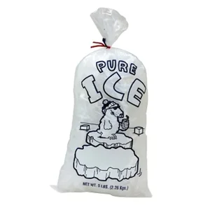 Each bag is pre-printed with a playful polar bear design and the text 'Pure Ice,' ensuring a professional presentation. With a thickness of 1.5 mil, these bags stand up to the rigors of freezing temperatures and heavy use.