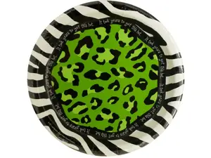 Celebrate your special day with the Jungle Print Birthday Plates Set. This 8-piece set features an eye-catching design with a mix of zebra stripes and leopard print in vibrant green, black, and white. Each plate is crafted from durable cardboard, making them perfect for party use. The unique phrase, 'It took years to get this hot,' encircles the plates in a fun border. Measuring approximately 8 3/4 inches in diameter, they are ideal for serving up birthday treats.
