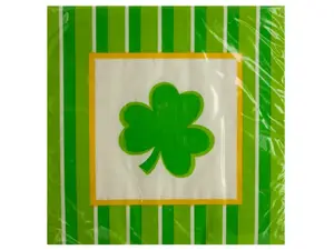 Celebrate St. Patrick's Day with these festive lunch napkins! This set includes 18 high-quality, 2-ply napkins, each adorned with a vibrant shamrock design on a white background. The napkins feature a cheerful yellow border and stylish green and white stripes for a festive touch.