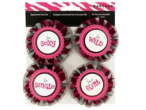 Get ready for a memorable bachelorette party with the Fun I'm With the Bride Bachelorette Party Pin Set. This set includes four stylish badge pins, each adorned with whimsical sayings and decorative edges, perfect for making everyone feel special. They come neatly packaged in a poly bag with a convenient hanging panel, making it an ideal choice for favors or party accessories. Celebrate love and friendship in style!