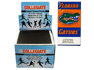 Show your team spirit wherever you go with the Florida Gators Pocket Tissue Packs. These collegiate licensed packs are perfect for on-the-go use, featuring vibrant team artwork that showcases your support for the Gators. Each pack is compact and measures approximately 4" x 1" x 2" and contains 15 2-ply plain white tissues. The individual tissue sheet size is 8" x 8", making them ideal for any situation when you need a quick and convenient tissue.
