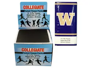 Support your favorite college team wherever you go with these Washington Huskies Portable Tissue Packs. Each colorful and collegiate-licensed pack is designed for convenience, featuring a resealable closure and vibrant team artwork. The packs are compact, measuring approximately 4" x 1" x 2" and contain 15 2-ply plain white tissues, each with a sheet size of 8" x 8".