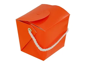 This Small Orange Gift Pail is perfect for packaging gifts and treats. It features a charming takeout style box with a convenient white nylon handle, making it easy to carry. With dimensions of approximately 2.5" x 3" x 2.25", it is ideal for small surprises or party favors.