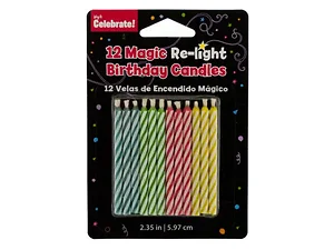 Add extra fun to your celebrations with our Colorful Magic Re-light Birthday Candles! This 12-piece set features vibrant, striped wax candles complete with lead-free wicks that ensure safety during use. A fantastic addition to any birthday cake, these candles continuously relight after being blown out, adding a magical touch to your party. Each candle measures approximately 2.35 inches long and comes carefully packaged in a blister pack for convenient storage and use.