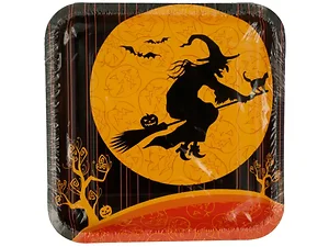 Get ready for a spooky celebration with the Witches Crossing Square Halloween Party Plates. This set includes 8 square plates, each beautifully designed with a witch riding her broomstick against a full moon. The vibrant black, purple, and orange striped background adds a festive touch to your Halloween gatherings.
