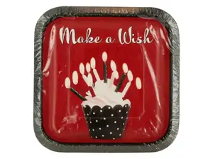 Celebrate special birthdays with our Cupcake Blowout Party Plates Set! This set includes 8 vibrant, square plates in red and black, each adorned with a delightful image of a cupcake topped with lit candles and the cheerful phrase 'Make a Wish'. Perfect for your birthday festivities, these plates are designed to add a festive touch to your party.
