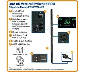 The TrippLite 30A Vertical Switched PDU (PDUMV30NET) offers reliable power distribution to your critical equipment. With 24 controllable outlets and advanced monitoring capabilities, this PDU enhances efficiency and safety in your power management.
