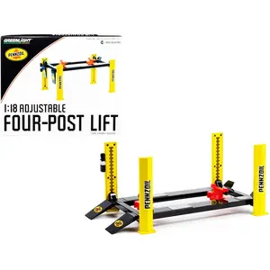This premium Pennzoil Adjustable Four Post Lift is specifically designed for 1/18 scale diecast model cars, providing a realistic way to display and elevate your favorite vehicles. Made with meticulous attention to detail, this lift replicates the look of an authentic garage lift. The adjustable height feature offers versatility for various models, making it a perfect addition to your diecast collection.