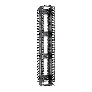 The Panduit High Capacity Vertical Cable Management System is designed for optimal organization and management of cable systems within a rack. With its sleek black finish and high-capacity design, it provides a reliable solution for efficient cable routing and maintenance.