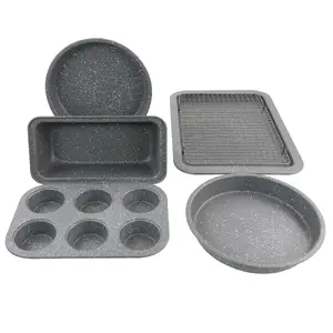 The elegant greystone finish brings a touch of sophistication to your kitchen. This versatile set includes essentials for all your baking needs: two round cake pans, a six-cup muffin pan, a loaf pan, a cookie sheet, and a cooling rack.