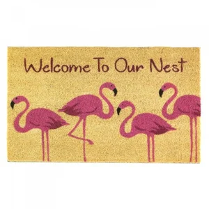 Enhance your home entrance with the Playful Flamingo Doormat. This charming coir mat greets your guests with a vibrant flamingo design and the welcoming phrase 'Welcome To Our Nest'. Perfect for adding a touch of fun and personality to your doorway, it combines style and functionality.