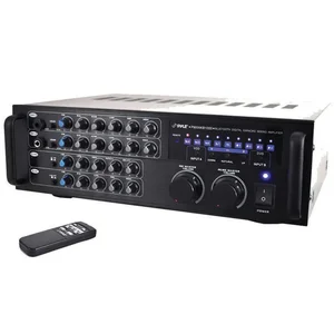 ? Karaoke/PA stereo ? 2 microphone mixing with Bluetooth(R)/RCA audio input;? Microphone talk-over function;? Dual-channel (A/B) digital amp design;? 2 front & 2 back 1/4 microphone inputs;? 2 pair (L/R) speaker terminal/bind post connectors;? 3 pair RCA (L/R) audio outputs;? 2 pair RCA (L/R) audio inputs;? RCA video input/output connectors;? Effects loop (L/R) RCA connectors;? Compatible with outboard effects processors;? Input selector & digital key controls;? Front panel rotary control center;? Independent microphone audio controls;? Audio master volume & microphone master volume control;? Microphone echo/low/high/repeat/delay control;? Music low/mid/high/balance control;? Built-in ventilation cooling fan;? Rack-mountable system;? Bluetooth(R) 3.0 music streaming;? 1,000W max power output;? 500+500 @ 4ohm ;? 350+350 @ 8ohm ;? Signal-to-noise ratio: 65dB;? T.H.D.: .5%;? Freq resp: 20Hz-20kHz;? Noise level: 35dB;? Rack-mount brackets;? Includes RCA cable, remote & power cable;