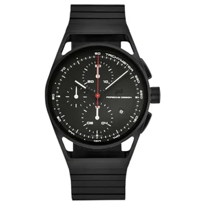Porsche 6020.1020.03022 Men's 'Chronotimer' Black Dial Black Titanium Bracelet Automatic Watch Porsche 6020.1020.03022 Men's 'Chronotimer' Black Dial Black Titanium Bracelet Automatic Watch features a titanium 42mm case, a black dial, and a sapphire crystal. The 20mm titanium band is fitted with a deployment clasp. This wrist watch is powered by Sellita Calibre SW500 automatic m ovement. This watch has a water resistance of up to 330 feet/100 meters, suitable for short periods of recreational swimming. Features: Brand: Porsche Model number: 6020.1020.03022 Case Shape: Round Dial window material type: Sapphire Display Type: Analog Clasp: Deployment Clasp Case Material: Titanium Case diameter: 42 millimeters Case Thickness: 15.5 millimeters Band Material: Titanium Band length: 8 inches Band width: 20 millimeters Band Color: Black Dial Color: Black Bezel Material: Titanium Bezel Function: Fixed Movement: Automatic Water-resistant depth: 100 meters UPC: Porsche 6020.1020.03022 MSRP: $ 4,850