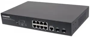 Provides power and data connection for up to eight PoE network devices- Save time and money by delivering data and power via existing network cables- For use on desktop or mounted in standard 19" rack- 10/100/1000 auto-sensing ports automatically detect optimal network speeds- Two small form-factor pluggable GBIC module slots (SFP)- IEEE 802.3at/af-compliant RJ45 PoE/PoE+ output ports- Power output up to 30 watts per port*- PoE power budget of 140 watts- PoE surge protection (4 kV) for all RJ45 ports- 20 Gbps switch fabric- Supports IEEE 802.3at and IEEE 802.3af-compliant PoE devices (wireless access points, VoIP phones, IP cameras, etc.)- Green Ethernet power-saving technology deactivates unused ports and adjusts power levels based on the cable length- Complies with the IEEE 802.3az (Energy Efficient Ethernet EEE) specification- Supports IEEE 802.3at/af detection and short circuit, overload and high-voltage protection- All RJ45 ports with Auto-MDIX (auto uplink) support- Configuration via Web browser, Telnet or SSH- Supports SNMP management- PoE Management PoE port settings, priority and power-on delay- IGMP Snooping for multicast filtering- SNMP V1, V2C, V3 with RMON groups 1, 2, 3 & 9- Supports VLAN (tag-based and port-based)- Supports link aggregation (trunking)- Supports port mirroring- QoS (Quality of Service) bandwidth management- Broadcast storm control with multicast packet rate settings- Store and forward switching architecture- Supports jumbo frames up to 9 kBytes- Supports Rapid Spanning Tree/Spanning Tree protocol- IEEE 802.3x flow control for full duplex- Supports 8k MAC address entries- 512 kBytes buffer memory- High-efficiency fan delivers quiet, reliable cooling- Desktop-size metal case- Includes 19" rackmount brackets