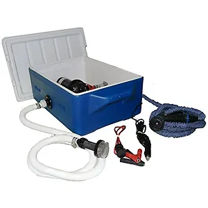 Kit Includes everything you need to washdown your boat , RV, water craft and more. Use any water available fresh or salt water. Complete with collapsing hose, spray nozzle, input hose with filter, 3.5 wash down pump, dual power option 12V cigarette lighter power cord, and battery clips to power from battery terminals. 70 PSI pressue. Fully ingition protected and CE approved washdown pump.