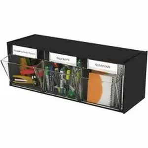 Modular unit with black frame and three clear bins features a unique interlocking design that lets you mix, match and stack different sizes. Mount bin storage system to a wall or place on a countertop. Bins tilt out, stay open and then close again with the touch of a finger. Each bin can be easily removed from locking mechanism for easy cleaning or refilling. Tilt Bin Storage System includes mounting hardware and identification labels.