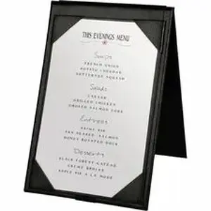 A-Frame Table Tent provides an attractive, effective way to display signs and menus. Double-sided design displays information from the front and back. Freestanding, A-Frame easily folds flat when not in use, making it perfect for specialty menus in restaurants. Picture corners hold signs in place. Signs are easily exchanged. Eye-catching leatherette fits the aesthetic of most environments.
