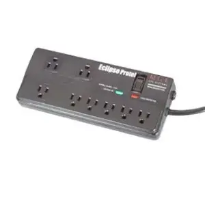 Eclipse ProTel surge suppressor - offers all the features of the Eclipse Pro surge suppressor with the added benefit of being able to protect your phone line. 120V, 1800W, 15A, (8) NEMA L5-15R output connections, 6-foot cord with NEMA 5-15P, (1) "Load protected" LED, (1) "Ground OK" LED, Audible alarm, black.