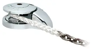 Model: RC8812VThe powerful RC8-8 fully automatic rope/chain windlass can be used with 8 mm (5/16 in) chain spliced to 14 mm three strand or 8-plait rope. The ingenious Wave DesignTM rope/chain gypsy (chainwheel) is able to accommodate a wide range of chain pitch differences within the specified chain size diameters suitable for use with the RC8 Series. Simple two piece installation saves time and money and allows easy retrofitting without disassembly of the windlass. Unique spacer tube design allows installation through virtually any deck thickness and the multiple mounting positions and self aligning gearbox ensure optimal location of gearbox and motor in virtually all installation situations. The RC8 features Maxwell's revolutionary and patented