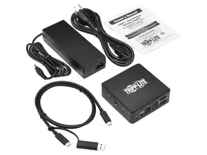 Tripp Lite USB-C Docking Station Turns Your Devices USB or Thunderbolt 3 Port into a WorkstationThis multiport USB-C dock with PD Charging expands the potential of your Windows laptop, Chromebook, tablet or other device with a USB-A, USB-C or Thunderbolt 3 port. It's ideal for transmitting 1080p video and digital audio to multiple large displays, adding a thumb drive and other USB peripherals, powering and charging a PD Charging-compliant mobile device, and connecting to a Gigabit Ethernet network all at the same time.Transmits Crystal-Clear Hi-Def Video and Digital Audio to Multiple HDMI DisplaysTwo HDMI outputs support individual high-definition resolutions up to 2560 x 1440 at 50 Hz. By downloading and installing the proper DisplayLink drivers to your host device, you may connect two HDMI displays simultaneously. This allows you to display the image from the host computer on both monitors, extend your host desktop across both with different windows open on each, or combine all into one large display as a video wall. Maximum resolution when both video ports are connected at the same time is 1920 x 1080 (1080p) at 60 Hz.USB Hub Ports Connect Keyboards, Thumb Drives and Other PeripheralsThree USB-A hub ports accept USB peripherals, such as flash drives, mice, keyboards and printers. All support fast USB 3.2 Gen 1 data transfer rates up to 5 Gbps and are backward compatible with USB 2.0 and USB 1.1 devices. One also supports BC 1.2 charging with 5V 1.5A (7.5W) of power dedicated to fast-charging your mobile device (and 2.4A for Apple devices).PD Charging Port Charges the Connected Notebook, Tablet or Other DeviceConnect your host device to the USB-C Power Delivery port, which supports PD 3.0 charging of connected PD Charging-compliant devices, such as laptops, Kindles, iPads and Android smartphones, up to 20V 4.25A (85W). The included power supply, when plugged into an AC outlet, provides the charging power.Accesses a Wired Gigabit Ethernet NetworkThe RJ45 port offers access to a Gigabit Ethernet network when Wi-Fi is unavailable or when a wired connection offers faster speeds. Connect using a UTP cable (sold separately), and enjoy true 10/100/1000 Mbps Ethernet speeds for fast data transfers.Connects Speakers, Microphone and Other Audio EquipmentThe 3.5 mm mini stereo jack is convenient for connecting speakers, headphones or a microphone to your workstation. You can listen to music or record the latest episode of your podcast.Anti-Theft Lock Protects the USB Docking Station When You Aren't AroundConnect a user-supplied computer/laptop security cable lock (not included) to this K-lock port to protect your source device against theft.Detachable USB-C Cable Connects in Either DirectionUnlike traditional USB cables that connect in only one direction, the reversible USB-C male connector plugs into a USB-C or Thunderbolt 3 port in either direction for an instant connection every time. An included adapter allows you to connect the cable to your devices USB-A port, though the device will only charge when connected to the USB-C PD Charging port.