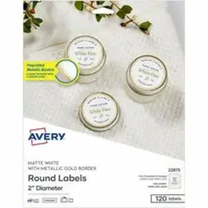 Brilliantly reflective and luxurious, this pack of 120 Avery 22875 Metallic Gold Border Labels brings a radiant shimmer to any event or project. Each 2" round Avery sticker is pre-printed with a stunning gold, foil-like border sure to capture everyone's attention. Avery Easy Peel technology makes it a snap to quickly peel and place your labels. Just bend the label sheet back to expose the pop-up edges, peel, and apply without risking tears or rips. Backed by strong, permanent adhesive, Avery round labels stick and stay to most smooth surfaces, including paper, envelopes, cardboard, metal, and glass, without curling or falling off. You can create professional-looking envelope seals, candle labels, thank you labels, food labels, sugar scrub labels, favor labels, and more using Avery Design & Print Online. Our easy-to-use design software offers label templates, design tools, and everything you need to customize your labels. These printable blank labels are compatible with both laser printers and inkjet printers resulting in crisp, smudge-free printing and consistent, professional results. You can even handwrite on each label for quick, one-of-a-kind personalization. Create a cohesive look for your event by pairing these labels with other Avery labels, cards, tags, and tent cards in our collection of metallic gold border products.
