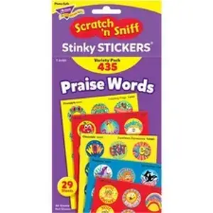 Variety pack of Stinky Stickers with praise words offers a fun way to give out rewards, incentives, and collectibles. Each large round sticker has a burst of fragrance waiting to be scratched and sniffed. Stickers are acid-free, nontoxic, and safe for use on photos. Each sheet has 15 stickers. Actual sticker sheets may vary from photo. Stickers are ideal for kindergarten to third-grade (ages 5 to 8).
