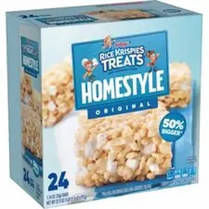 Discover a delicious take on a classic, Rice Krispies Treats Homestyle Original Crispy Marshmallow Squares. We've taken puffed rice cereal and mini marshmallows to craft our thickest, gooiest homestyle recipe. Every 33g bar is 50% bigger than our Original 22g bar and packed with pockets of melted marshmallows from top to bottom; The result is in our thickest, gooiest homestyle treat that the whole family can enjoy. Each package contains one individually wrapped marshmallow bar that's perfect for snacks at school, the office, car rides, lunchtime, TV time, and more. Take this deliciously convenient, ready-to-eat treat wherever you and your family travel. Unwrap the simple goodness of Rice Krispies Treats Homestyle Original and feed your sweet cravings day or night.