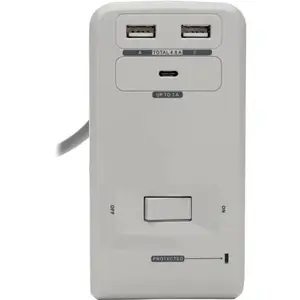 • 6 NEMA 5-15R outlets distribute AC power to connected home/office equipment;• 1,080 Joules protect valuable electronics against dangerous surges and spikes;• 1 USB-C(R) port plus 2 USB-A ports (2.4 amps) for fast charging of phones, tablets, and other mobile devices;• Spring-loaded clamp attaches to flat surface up to 2.5 in. thick for use anywhere;• Lighted on/off switch for 1-touch control over connected equipment;• Green LED indicates connected electronics are protected;• 8-ft. cord with NEMA 5-15P plug pivots 90deg to accommodate installation to a horizontal or vertical surface ;• Lifetime limited warranty; 50,000 Ultimate Lifetime Insurance (US, Canada, and Puerto Rico);• Includes owner's manual;