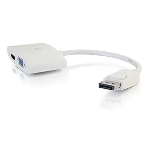 General InformationSend a video signal from a tablet, laptop computer, or another source device with a DisplayPort output port to a projector, monitor, or HDTV with an HDMI or VGA input port. This compact adapter converter is an ideal solution for use in schools, conference rooms, or other work spaces that may utilize assorted displays with varying inputs.Convenience Be prepared for any meeting, presentation, or event with the full confidence that you have the right connections in an compact design. The DisplayPort to HDMI or VGA adapter converter allows you to connect a DisplayPort equipped laptop or tablet to a projector, monitor, or HDTV with an HDMI or VGA input port. The compact design of this adapter converter makes it a perfect fit for BYOD (Bring Your Own Device) applications in education or corporate environments.Performance This adapter converter carries a digital audio/video signal, supporting up to a 4K30 resolution for HDMI, up to 1920x1200 for VGA and meets the requirement of high performance applications. With plug and play convenience, the adapter converter does not require drivers for install and the device is powered through DisplayPort bus power, so no additional power adapters are needed. The dongle-style adapter converter reduces strain on the video port. The cable between the DisplayPort connection and the adapter converter provides strain relief that protects the port from strain damage as cords are moved.Technical InformationCable Type: DisplayPort/HDMI/VGACable Length: 8"Connector on First End: 1 x 20-pin DisplayPort Male Digital Audio/VideoConnector on Second End: 1 x 19-pin HDMI (Type A) Female Digital Audio/VideoConnector on Second End: 1 x 15-pin DB-15 Female VGAFeatures: Strain ReliefShielding: YesDevice Supported: ProjectorDevice Supported: MonitorDevice Supported: Audio/Video DeviceDevice Supported: NotebookDevice Supported: TabletDevice Supported: HDTVDevice Supported: ComputerAmerican Wire Gauge: 32 AWGSupported Resolution: 1920 x 1200Physical CharacteristicsColor: WhiteWeight (Approximate): 2.05 ozMiscellaneousEnvironmentally Friendly: YesEnvironmental Certification: RoHSWarrantyLimited Warranty: 3 Year