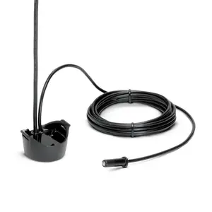 In-Hull Dual Spectrum CHIRP Transducer supports Dual Spectrum CHIRP 2D Sonar with high frequency beam and wide cone angle, offering CHIRP range of 150-220kHz and max depth of 1200ft. Intended for glue-in installation inside single layer fiberglass hulls. Includes built-in temperature sensor, epoxy kit and 20 feet cable.