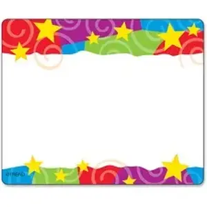 With a cheerful, fun design, self-adhesive name tags are perfect for children. Each name tag has colorful swirls and yellow stars. Write a name on the area between the vivid borders on the top and bottom. The easy-writing finish is designed for pens or markers. Bright, friendly design is also ideal as labels for charts, folders, and storage boxes. Keep a variety on hand for open houses, science fairs, field trips, and conferences. The 3" x 2-1/2" name tags are designed for students in prekindergarten to ninth-grade (ages 3 to 15).