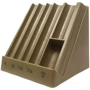 • 5 columns for each coin denomination;• Angle allows easy manipulation of change and prevents spills;• Holds over $100 in change;• Dimensions: 6.25 in. L x 5.6 in. W x 6.5 in. H;• Includes clear cover for easy transportation and storage;