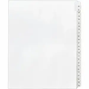 Marketing Information:Dividers are ideal for index briefs, legal exhibits, mortgage documentation files and more. White paper stock features clear RipProof reinforced side tabs that are printed on both sides. Tabs are printed with Allstate Style (Helvetica Regular type). Binding edge is unpunched so indexes can fit any binding system.
