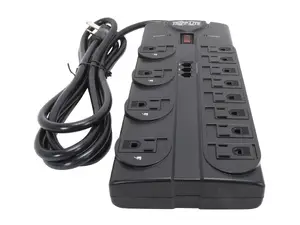 • 12 outlets with child safety covers can accommodate up to 4 transformers without blocking remaining outlets;• 2,160 Joules of suppression ;• Built-in RJ11 jacks prevent surges from damaging your modem/fax equipment;• Diagnostic LEDs indicate protection and ground status ;• Protects all electronics;• 15-amp resettable circuit breaker;• EMI/RFI noise filtering;• Auto shutoff permanently cuts power to outlets if protection circuit is incapacitated, preventing equipment damage and indicating replacement is required;• Keyhole slot for mounting options;• 8-ft. cord with right-angle plug for connection to a wall outlet located behind furniture;• Lifetime limited warranty;• $150,000 Ultimate Lifetime Insurance (US, Canada, and Puerto Rico);• Includes 6-ft. telephone cord and instruction manual;