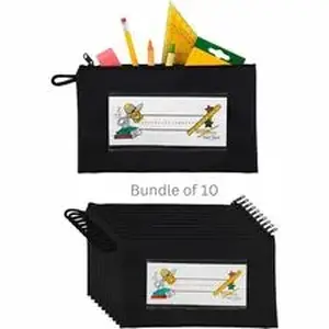 Purchase this durable pencil pouch with zipper in a bulk bundle of 10 and save! This easy to open, expandable, zippered pencil pouch can easily hold a box of colored pencils or crayons, and other school supplies. It has a loop for hanging. The pen storage case has a colorful name tag which easily slides into the clear name card sleeve. The easy to wash fabric school supply pouch is perfect for school supplies, math game pieces, and so much more.