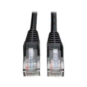 Tripp Lite's 10-ft. (3.05 m) black snagless category 5e (Cat5e) patch cable has 2 snagless RJ45 molded male connectors featuring integral strain relief. The cable is manufactured from PVC 4-pair stranded UTP and is rated for 350MHz/1Gbps communication. All cables are offered in a variety of lengths and colors for all category 5 (Cat5) and 5e cabling needs. Standard category 5e patch cables are also available.