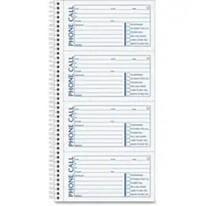 Phone Message Book provides ample message forms for a busy company. Each page includes four message forms with two-color printing and a carbonless white duplicate. Each form offers a place to fill in message recipient, date, time, name of caller, caller's phone number and company, three lines for the actual message and a line for the message-taker to sign. Boxes on the side offer shortcuts for you to check whether the caller only phoned, returned a call, will call again, visited or wants to see the message recipient. Once you tear out the message originals along the perforations, copies stay bound in spiral-bound book for future reference. Each book has 400 sets. Detached size is 2-3/4" x 5". White paper and chipboard backer are recyclable.
