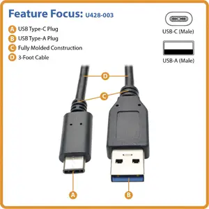 Tripp Lite by Eaton U428-003 USB-C Male to USB-A Male 3.1 Gen 1 Cable, Thunderbolt 3 Compatible, 3 Ft., U428-003