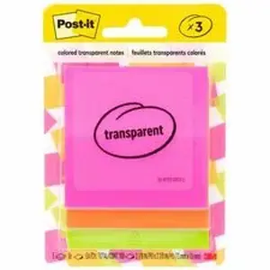 Jot down your thoughts and ideas without covering the underlying text using these Post-it Transparent Notes. They are great for use with books, crafts or other projects where you need to make notes on items and see underneath easily. Clear sticky notes are ideal for studying and making notes in textbooks. You can see through to highlight or call out specific content. They're also great for crafts to trace images or patterns from other items. Like all Post-it products, they feature a unique adhesive that's designed to stick to paper and then remove cleanly without leaving any marks or damage. Use pens, markers, pencils and color pencils on the transparent film made of recycled plastic. This pack includes three transparent colors: pink, green and orange. Each pad contains 36 sheets per pad.