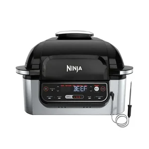 • Refurbished;• Smart cooking system for ideal levels of doneness;• Foodi(TM) smart thermometer monitors food temperatures;• 5-in-1 unit grills, air crisps, bakes, roasts, and dehydrates;• Smoke control system for virtually smoke-free grilling;• Nonstick, removable parts are dishwasher safe;• Includes 1,760 watt Ninja(R) Foodi(TM) smart grill, 10 in x 10 in. high-density grill grate with nonstick PTFE/PFOA-free ceramic coating, 4 qt.crisper basket with nonstick PTFE/PFOA-free ceramic coating, 6 qt. cooking pot with TFE/PFOA-free ceramic coating, Foodi(TM) smart thermometer, cleaning brush, and chef-created 150recipe book;