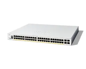 The Catalyst 1300 series is a robust 48-port Gigabit Ethernet switch equipped with Power over Ethernet (PoE) capabilities. It features four 1 Gigabit SFP (Small Form-factor Pluggable) ports for flexible connectivity options.